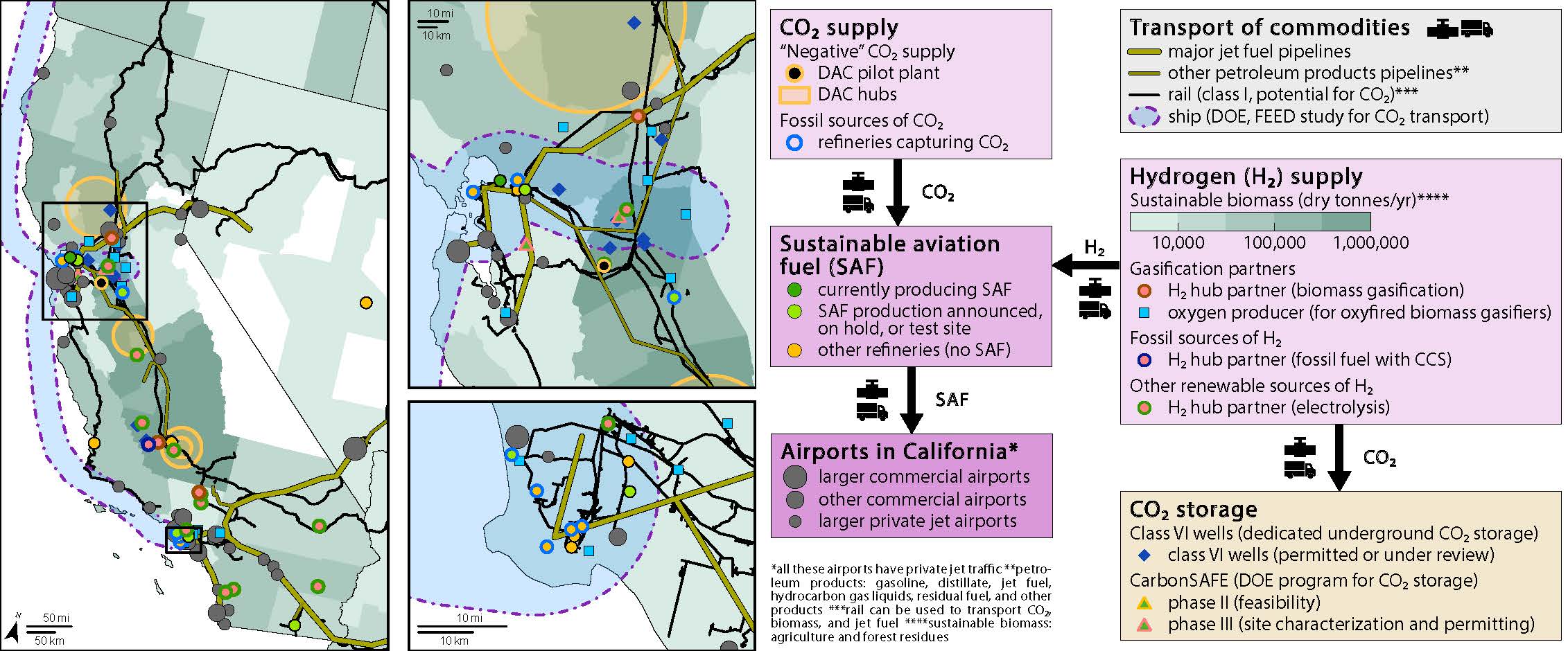 - develop regional “SAF hubs” co-locating DAC, biomass-to-hydrogen, FT units, and storage (e.g., Bay Area, Kern County)