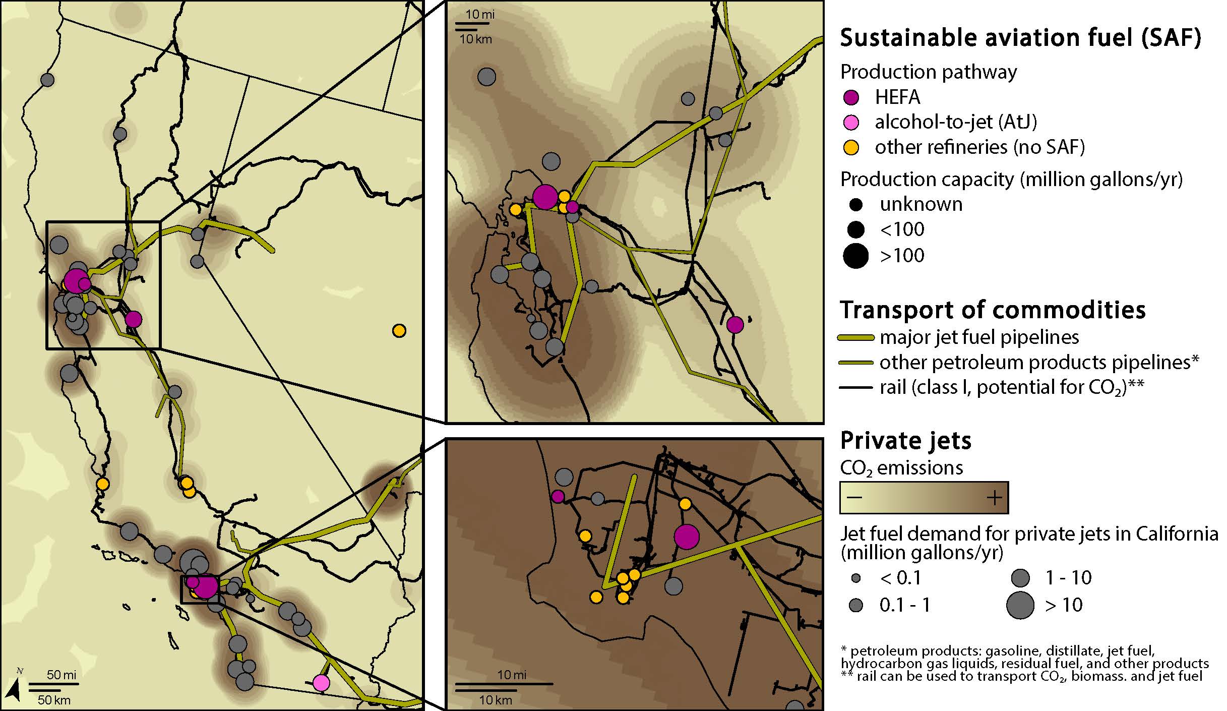 California as proving ground. We can also start where demand is concentrated. The Bay Area and Los Angeles are the perfect proving grounds: with ambitious climate targets, clean-fuel incentives, and refinery conversions (like Phillips 66 Rodeo, Chevron El Segundo). The region’s logistics—pipelines, ports, and rail—enable efficient feedstock and fuel transport (see Figures 1–2).