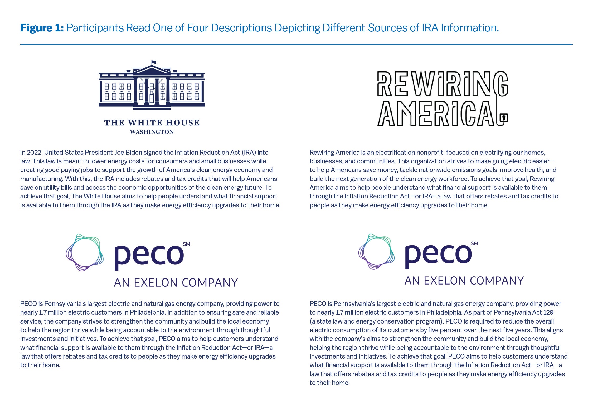 Lastly, with PECO being the utility provider for Philadelphia, and by localizing the study, we were able to test the effectiveness of such providers as IRA messengers (both with and without the added justification related to the Pennsylvania state law). Each source description shown to participants described the source itself and explained how they aimed to inform the public about the IRA benefits for home upgrades (Figure 1).