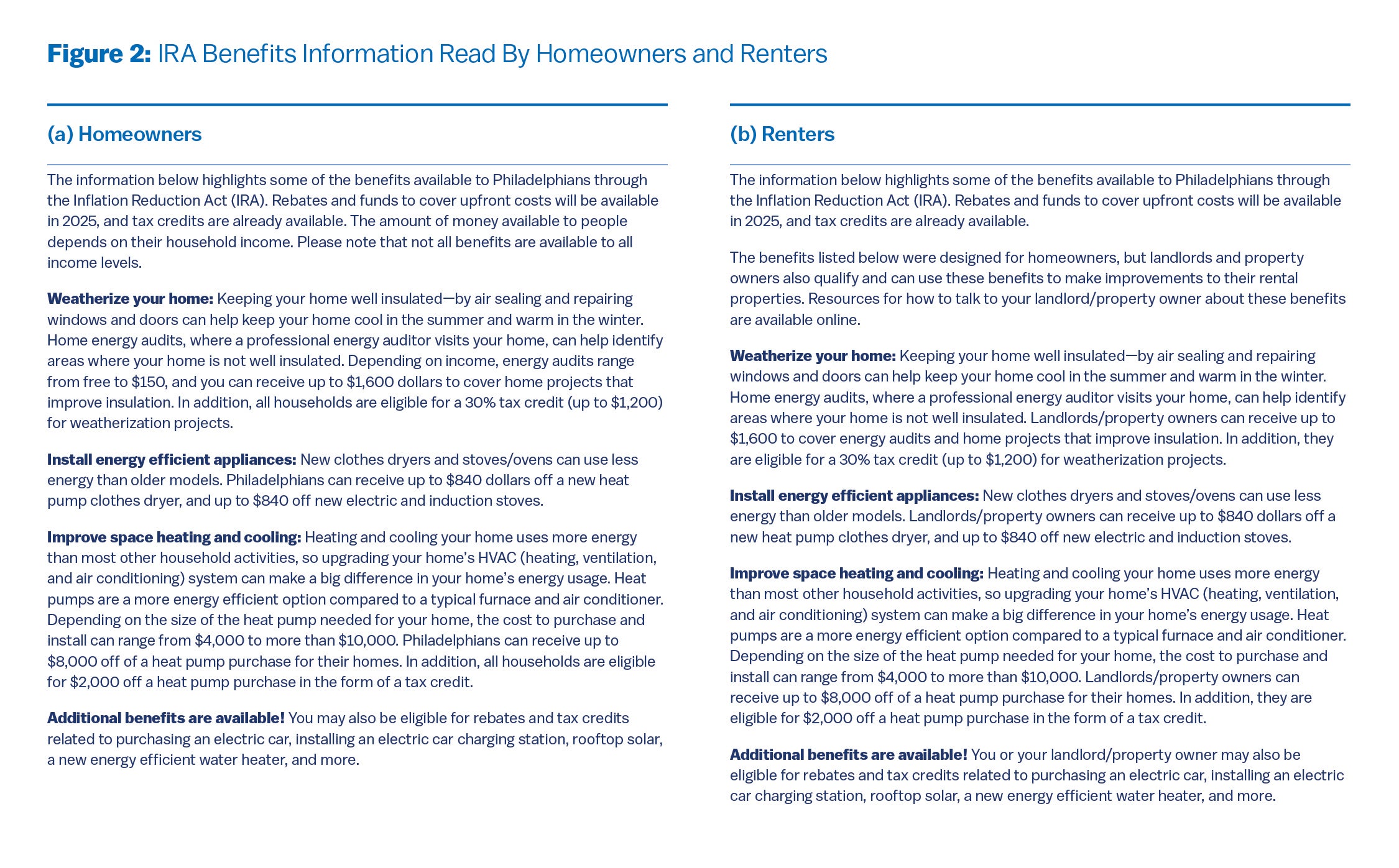 For example, Philadelphia (like many other cities) has local resources, services, and organizations—including the Philadelphia Energy Authority (PEA), Energy Coordinating Agency (ECA), and the city’s energy office—that may be important to engage with on issues relevant to renters or low-income community members. Communicators, therefore, should explore how these types of local organizations can connect high-need communities directly to benefits or explore ways to incentivize landlords to utilize them.