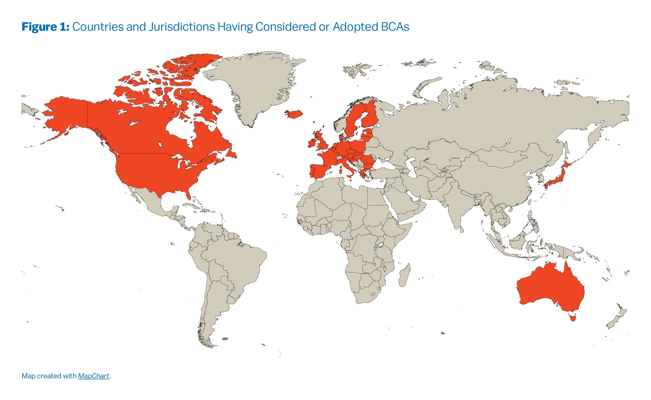 In addition, the governments of the United States, Canada, Australia, and Japan have also formally proposed or studied BCAs (see Figure 1). Not all of these proposed BCAs are purely economic in nature: the U.S. proposals, for example, would take the place of an economy-wide carbon price, and are at least partly geopolitical in objective.