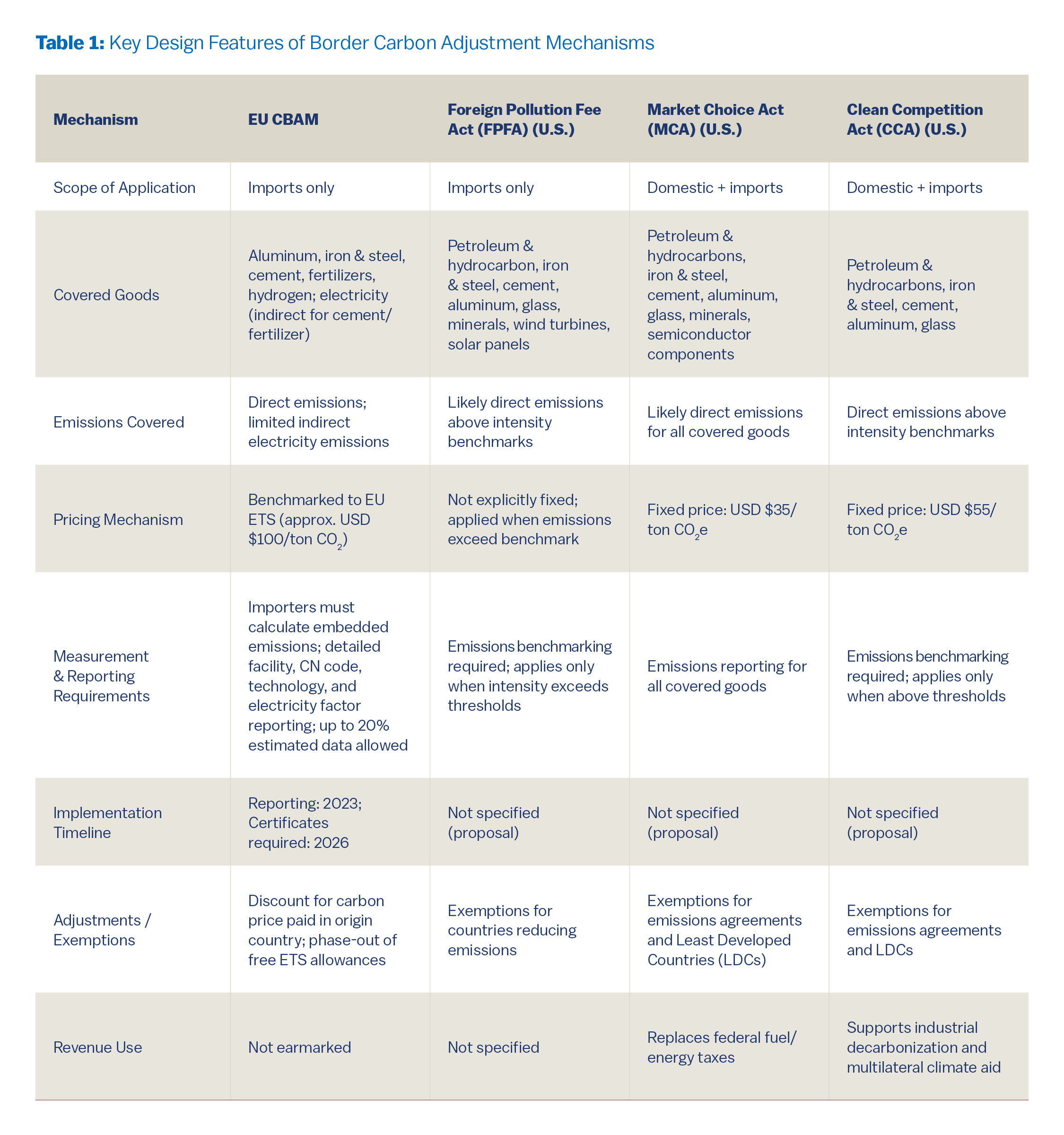Table 1 summarizes key features of these provisions in comparison to the EU CBAM. The three bills differ in coverage, with both the MCA and CCA applying to both domestic and imported goods while the FPFA applies only to imported goods. The bills also encompass different products. While all three include petroleum and hydrocarbon products, iron and steel, cement, aluminum, and glass, the FPFA and MCA also include minerals.