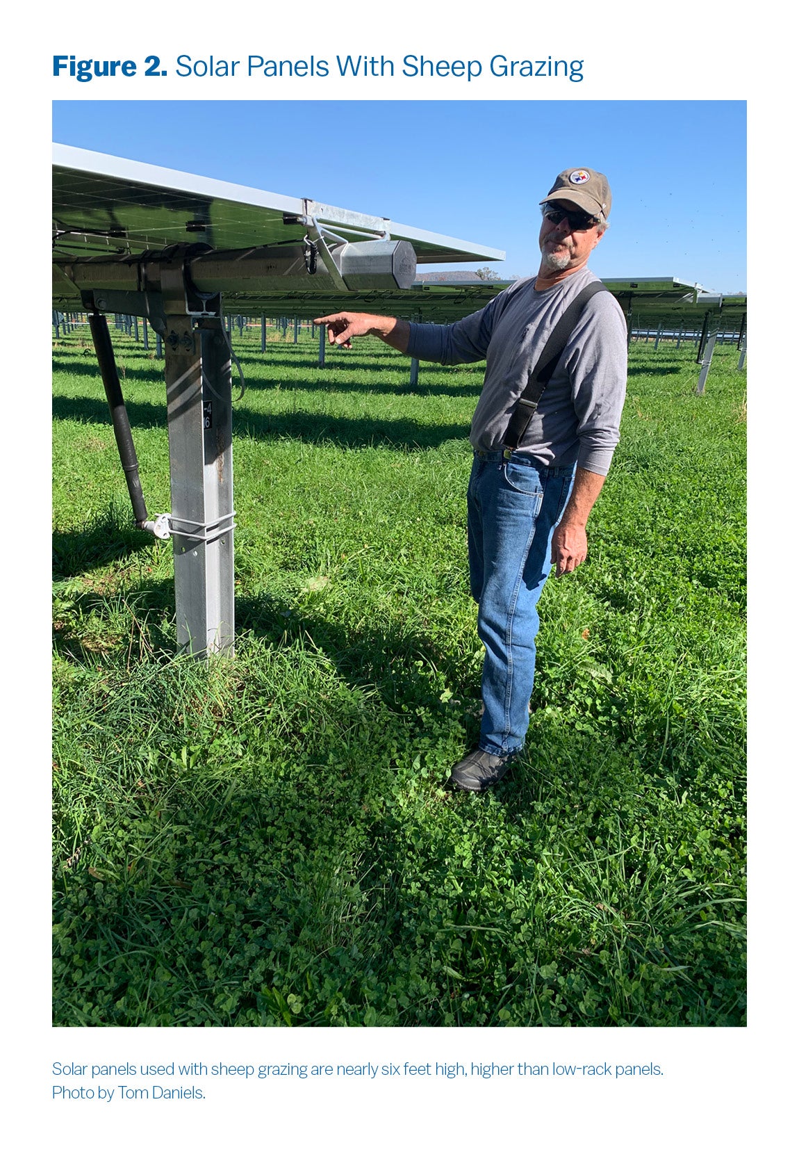 Standard low-rack agrivoltaics are usually three feet above the ground, leaving limited space for crop production or livestock grazing. Higher-rack agrivoltaics of five feet or above are more expensive to install because more steel is used, and the higher the panels, the harder and more dangerous they are to fix and maintain (see Photo 2). Overall, agrivoltaics tend to have higher capital costs than traditional solar development because more steel is needed for the racking along with more specialized design and installation (Boyd 2023).