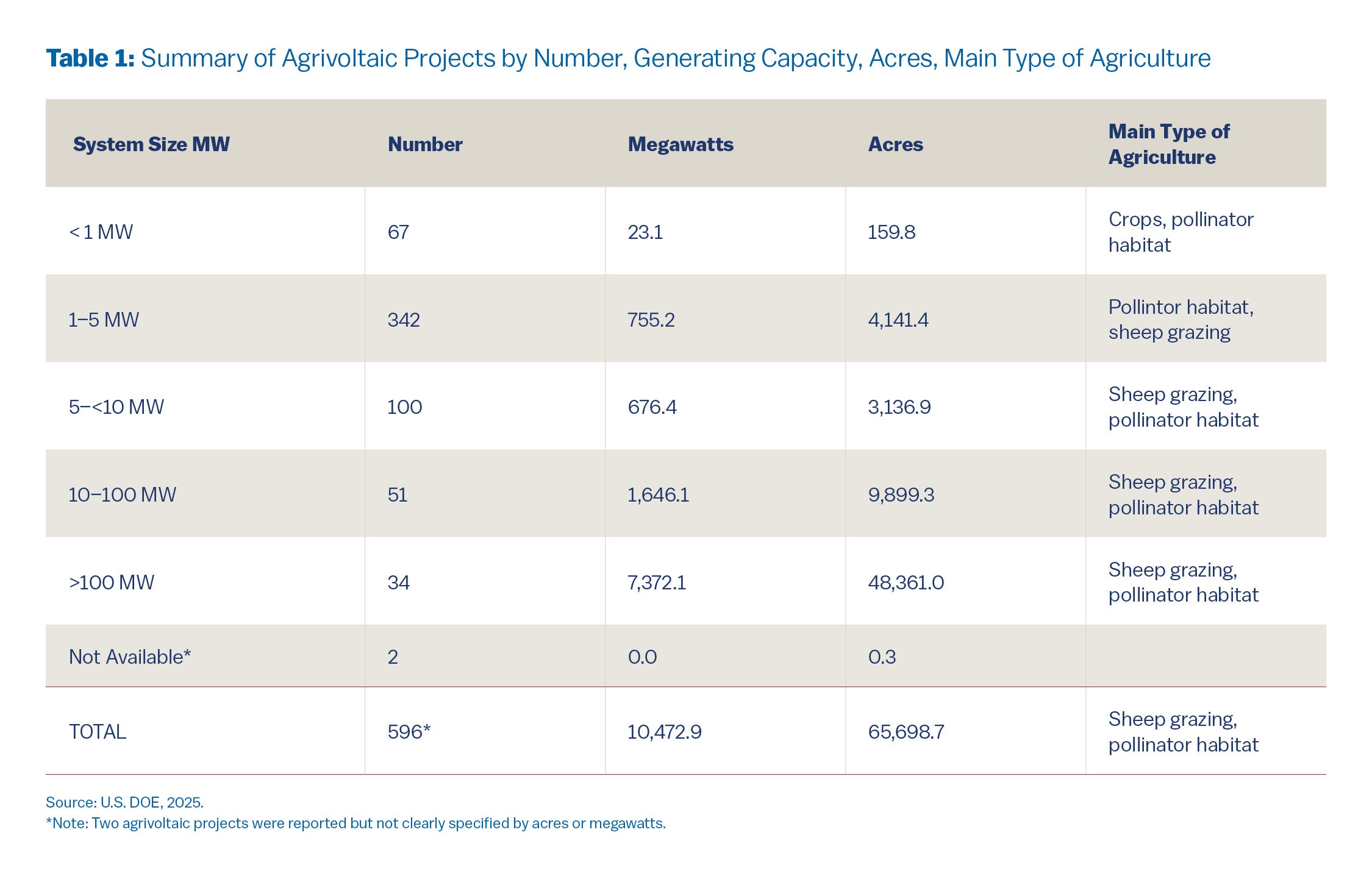 The National Renewable Energy Laboratory (NREL) a division of the U.S. Department of Energy, has launched a database of agrivoltaics projects to track the locations, types, and sizes of projects. As of early 2025, the NREL had identified 596 agrivoltaic sites covering 65,699 acres, and producing 10,473 MW, enough electricity to power about 7.5 million homes (U.S. DOE 2025)(see Table 1). The website includes a list of all of the known agrivoltaic sites in the U.S., the agricultural activities on each site, the generating capacity in megawatts, the photovoltaic technology, and the type of solar array (fixed or tracking the sun). However, the agrivoltaic projects are self-reported by the operators and tend to result in an undercount of the actual number of agrivoltaic projects. For example, alternative estimates of agrivoltaic grazing land across the U.S. range as high as 100,000 acres (Penn State 2023).